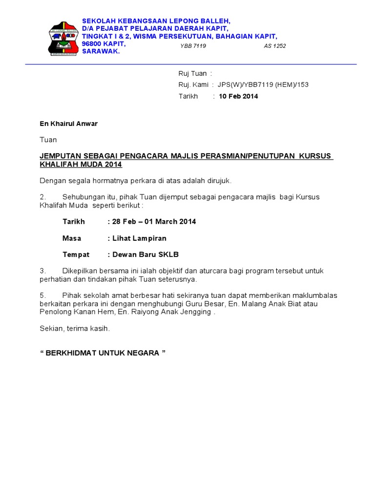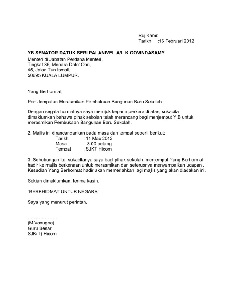 . Contoh surat jemputan sebagai perasmi. Contoh surat jemputan rasmi ke majlis perasmian sekolah guru sekolah. Surat rasmi jemputan ke majlis.